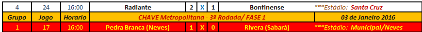 Campolina FC (Esmeraldas) Campeão! Jogo da Semana FBH!, por Alex Xavier FBH! (*) ICA venceu nas penalidades máximas Jogo da Semana FBH!, por Alex Xavier FBH! Clique aqui e leia resenha do jogo da Semana FBH! Clique aqui e leia resenha do jogo da Semana FBH! Clique aqui e leia resenha do jogo da Semana FBH!, por Rômulo Pastor FBH! Clique aqui e leia resenha do jogo da Semana FBH!, por Pitangui FBH! Clique aqui e leia resenha do jogo da Semana FBH!, por Rômulo Pastor FBH! Clique aqui e leia resenha do Jogo da Semana FBH!, por Alex Xavier FBH! Clique aqui e Leia a resenha FBH! do Jogo Não oficial - para ver a TABELA de Classificação OFICIAL CLIQUE AQUI fonte: http://copa.itatiaia.com.br/informacao_detalhes/135 - 11/12/2015 as 19h40 DA PROMOÇÃO E APOIO: ART. 1º: A Rádio Itatiaia, com apoio da Federação Mineira de Futebol por meio dos Setores de Futebol Amador da Capital e do Interior, promoverá a 55ª Copa Itatiaia, temporada 2015/2016, na categoria de Amadores Adultos, com início em 20 de dezembro de 2015 e término previsto para 24 de janeiro de 2016. DOS PARTICIPANTES: ART. 2º: As associações participantes da 55ª Copa Itatiaia deverão atender aos seguintes requisitos: a)- Ter disputado integralmente o Campeonato Oficial do ano de 2015, promovido pelo Setor de Futebol Amador da Capital ou Liga Municipal; b)- Possuir licenciamento expedido pela Federação Mineira de Futebol (FMF); c)- Estar em dia com as obrigações esportivas e contábeis perante o Setor ou Liga a que estiver filiado. § Único: Além dos critérios estabelecidos neste regulamento, deverão também ser respeitados todos os critérios técnicos e disciplinares estabelecidos em notas oficiais emitidas pela FMF, coordenação da 55ª Copa Itatiaia e TDE. PARA A CHAVE DE BELO HORIZONTE: PARA A CHAVE METROPOLITANA OUTROS PONTOS A SEREM OBSERVADOS: ART. 3º: Participarão da 55ª Copa Itatiaia 2015/2016 as associações abaixo relacionadas, escolhidas dentro dos critérios pré-estabelecidos pela Comissão Organizadora e divididas em duas (02) Chaves distintas de quatro (04) grupos cada uma, sendo uma chave com clubes dessa Capital e a outra com clubes da Região Metropolitana, a saber: Chave BELO HORIZONTE Grupo I Grupo II Grupo III Grupo IV Inconfidência EC Concordia AA Portuguesa Providencia AR Verona Itamarati Aparecida AA Popular São Paulo Aliança FC Planalto EC Jonas Veiga Jonas Veiga Havaí FC Havaí Bonfinense EC Morro das pedras São Bernardo EC São Bernardo Araribá EC São Cristóvão Campo Verde FC São Bernardo ICA FC Borges Racing EC Universitário AE Universo Cabana Taça de Ouro FC Planalto Radiante FC Lagoa Chave METROPOLITANA Grupo I Grupo II Grupo III Grupo IV Rivera RC Sabará Campolina FC Esmeraldas Brumadinho FC Brumadinho EC Morro Velho Nova Lima AA Pedra Branca Rib. Das Neves Minas EC Betim AA Estrelinha Contagem Vila Nova MA Vespasiano Fluminense FC Matozinhos Granja Adélia FC Contagem São Caetano FC Betim A Bonsucesso EC Confins Oriente EC Mário Campos Real Satélite EC Sarzedo Real EC Ibirité Rio Verde FC Santa Luzia DAS FASES E DA PONTUAÇÃO: ART. 4º: A Copa Itatiaia 2015/2016 será realizada em quatro (05) fases distintas (cada fase se inicia com zero ponto) sendo: classificatória, quartas de final, semifinais, final das chaves e finalíssima, e terão os seguintes critérios de pontuação: a) No tempo normal: Três (03) pontos ganhos por vitória e zero (0) ponto por derrota, empate um (01) ponto; b) Na disputa por penalidades em caso de empate: A partida que terminar empatada terá disputa de pênaltis e a equipe vencedora somará (01) ponto extra. DA FASE DE CLASSIFICAÇÃO: ART. 5º: A fase de classificação será disputada em um (01) só turno. Cada associação jogará uma (01) única vez contra todas as demais associações integrantes de seu grupo. Estará classificada para a fase quartas de final a associação colocada em primeiro (1º) e segundo (2º) lugares dentro de seu Grupo. DOS CRITÉRIOS DE DESEMPATE: ART. 6º: Ao término desta fase, estando empatadas duas (02) ou mais equipes do mesmo grupo em pontos ganhos, as equipes classificadas serão definidas mediante os seguintes critérios: a)- Maior número de vitórias; b)- Melhor saldo de gols; c)- Se, após aplicados os critérios acima, duas (02) equipes e somente 02 (duas), ainda continuarem empatadas, serão consideradas classificadas a equipe vitoriosa no confronto direto entre elas, seja no tempo normal ou nas cobranças de pênaltis; d)- Se, após aplicados os critérios das letras “A” e “B”, mais de duas equipes estiverem empatadas, prevalecerão os critérios abaixo. e)- Maior número de gols marcados (Gols Pró); f)- Menor número de cartões vermelhos recebidos; g)- Menor número de cartões amarelos recebidos; h)- Sorteio. § Único: Nas aplicações dos critérios de desempate alíneas “B” e “E”, serão computados apenas os resultados e os gols conquistados nos tempos normais das partidas, não se considerando os gols conquistados nas cobranças de pênaltis. DAS RODADAS DUPLAS: ART. 7º: A Coordenação da Copa Itatiaia, a seu exclusivo critério e em qualquer fase da Copa, poderá optar por rodadas duplas, em campos e horários a serem por ela pré-designados. § Único: Os mandos de campo poderão ser estabelecidos, dentre outros, pelo critério de melhor campanha. DA FASE QUARTAS DE FINAL: ART. 8º: A fase Quartas de Final será realizada entre as oito (08) associações classificadas de cada chave (metropolitana e Capital), primeiras e segundas colocadas de cada grupo na fase preliminar em suas respectivas chaves reunidas em quatro novos grupos (A, B, C e D), de duas (02) equipes cada uma, totalizando oito (08) novos grupos, (04) da Capital e (04) da Metropolitana. § Primeiro: Por meio de confronto direto em cada grupo (A, B, C e D), em uma única partida, se conhecerá as quatro (04) equipes classificadas para a próxima fase. § Segundo: Os confrontos desta fase se
